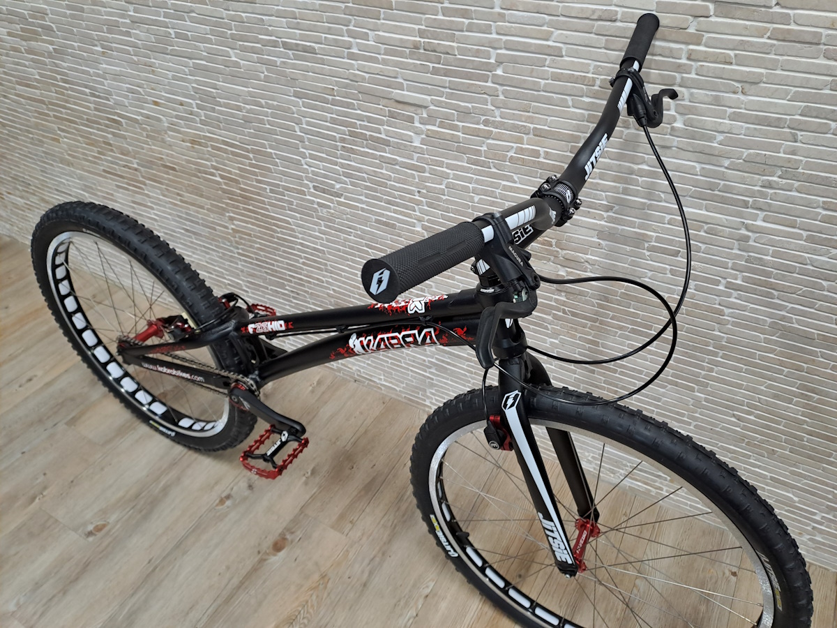Das Kabra F26HID mit custom Aufbau ist ein zuverlässiges Trial Bike, welches sich für Hobby- und Wettkampffahrer eignet. Leichter und robuster Aluminium Rahmen mit einem wendigen Radstand von 1075mm. Hochwertige und leichte Komponenten. Hydraulische Magura HS33R Felgenbremsen für eine kräftige Bremsleistung. 18 Zähne Freilaufritzel mit 108 Einrastpunkten vorne und 15 Zähne Schraubritzel hinten. Robuste Aluminium Kurbeln mit ISIS Vielzahnaufnahme in 170mm länge. Leichte Singlewall Felgen mit industriegelagerten Naben und Jitsie Trial Reifen.
