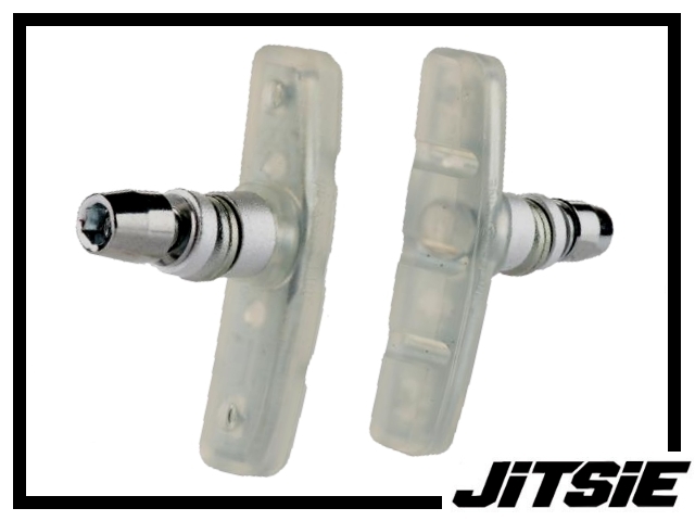 sehr weicher Trial Bremsbelag für V-Brakes. Sehr hohe Bremskraft auf glatten Felgen. Inkl. Hülsen und 5mm Innensechskantschraube. Farbe transparent. Paarpreis.