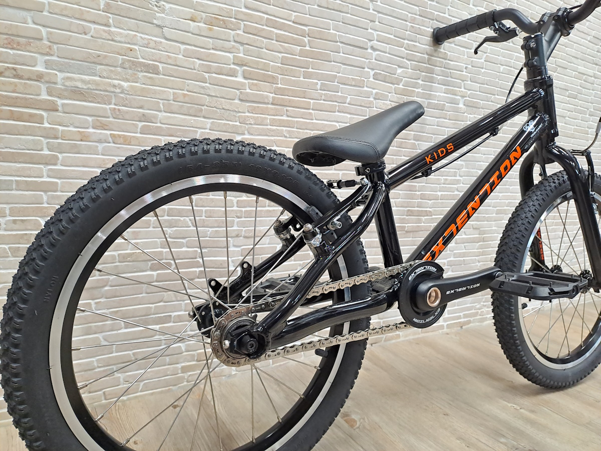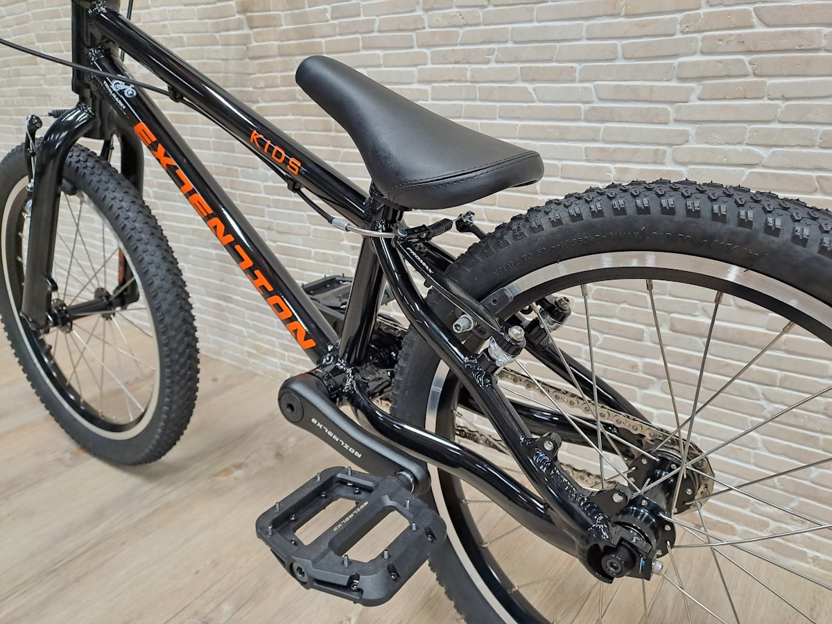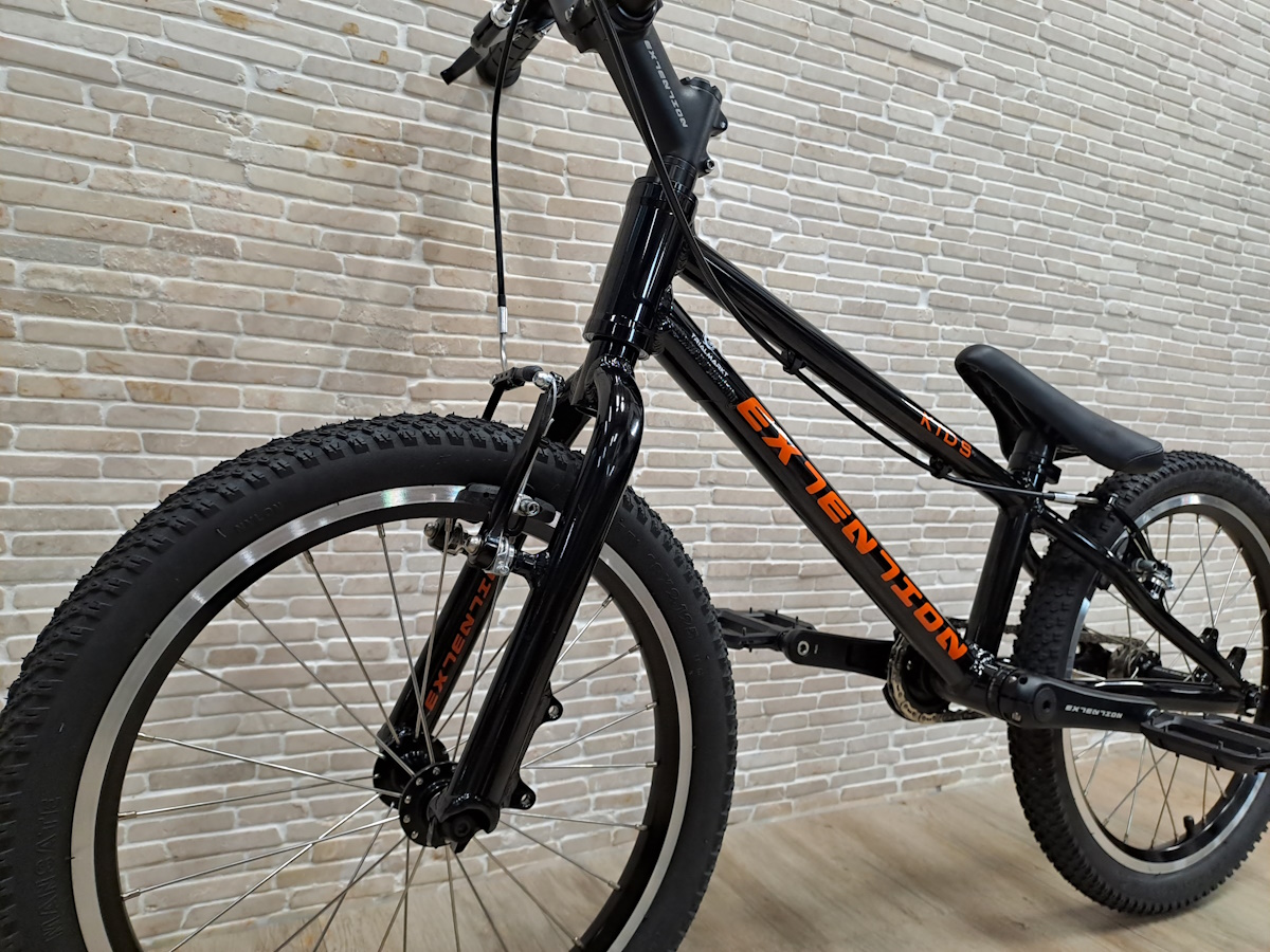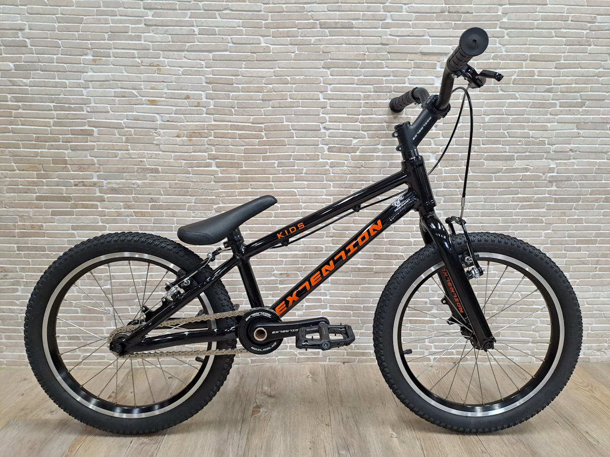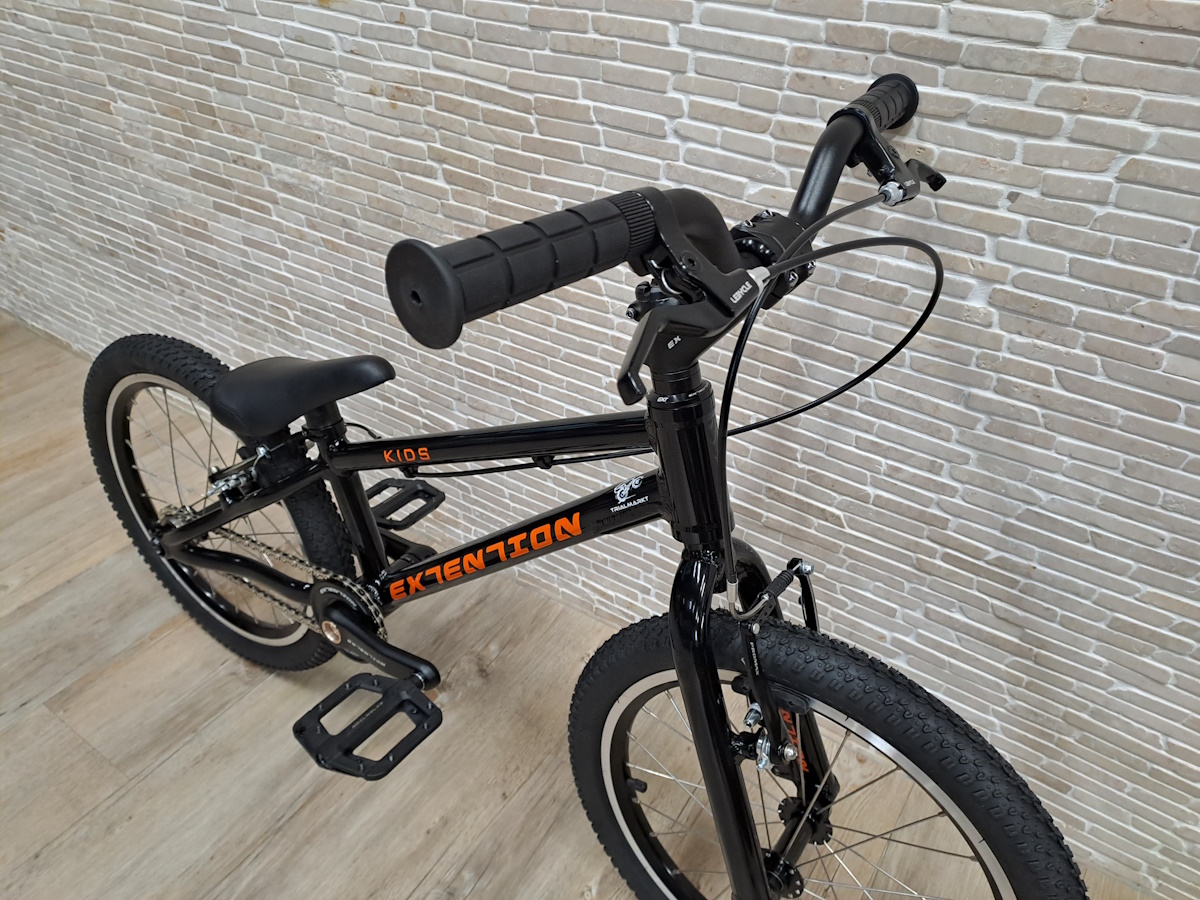 Das kleine Extention Kids mit 18" Laufrädern ist für die jungen Einsteiger gedacht, welche ein hochwertiges und leichtes Streetbike suchen mit zuverlässigen Komponenten. Kurzer Aluminiumrahmen, sehr wendig und in jeder Situation gut zu kontrollieren. Top Ausstattung mit Aluminium Lenker, Aluminium Gabel und einer Extention Kurbeleinheit mit durchgehender 24mm Stahlachse mit Vielzahnaufnahme. Solider Bashring mit Stecksystem und integriertem 21 Zähne Ritzel. Singlespeed mit horizontalen Ausfallenden und Freilaufritzel hinten bei 21:14 Zähne Übersetzung. Aluminium Hohlkammerfelgen und industriegelagerte Naben. Griffige Nylon Plattform Pedale mit geschraubten Stahlpins.