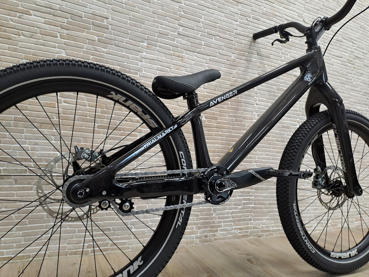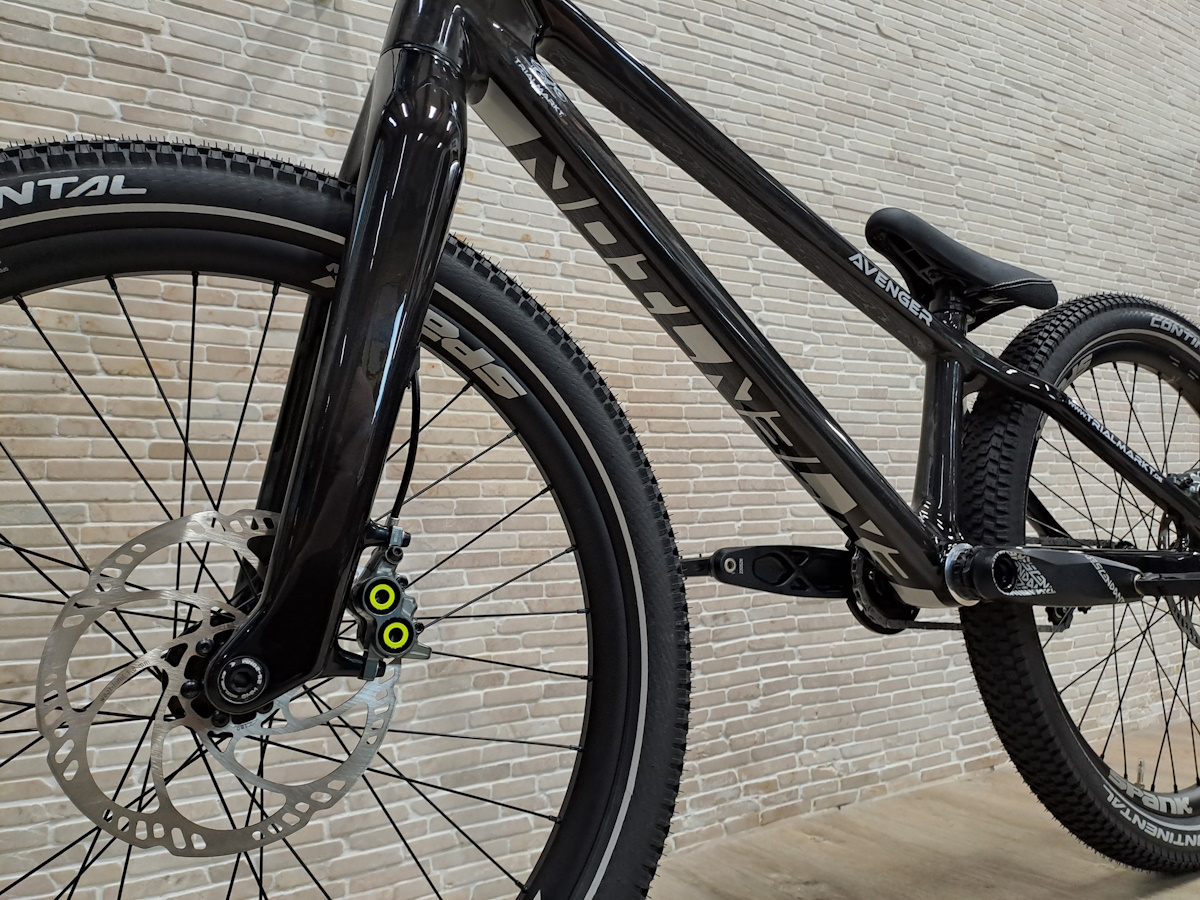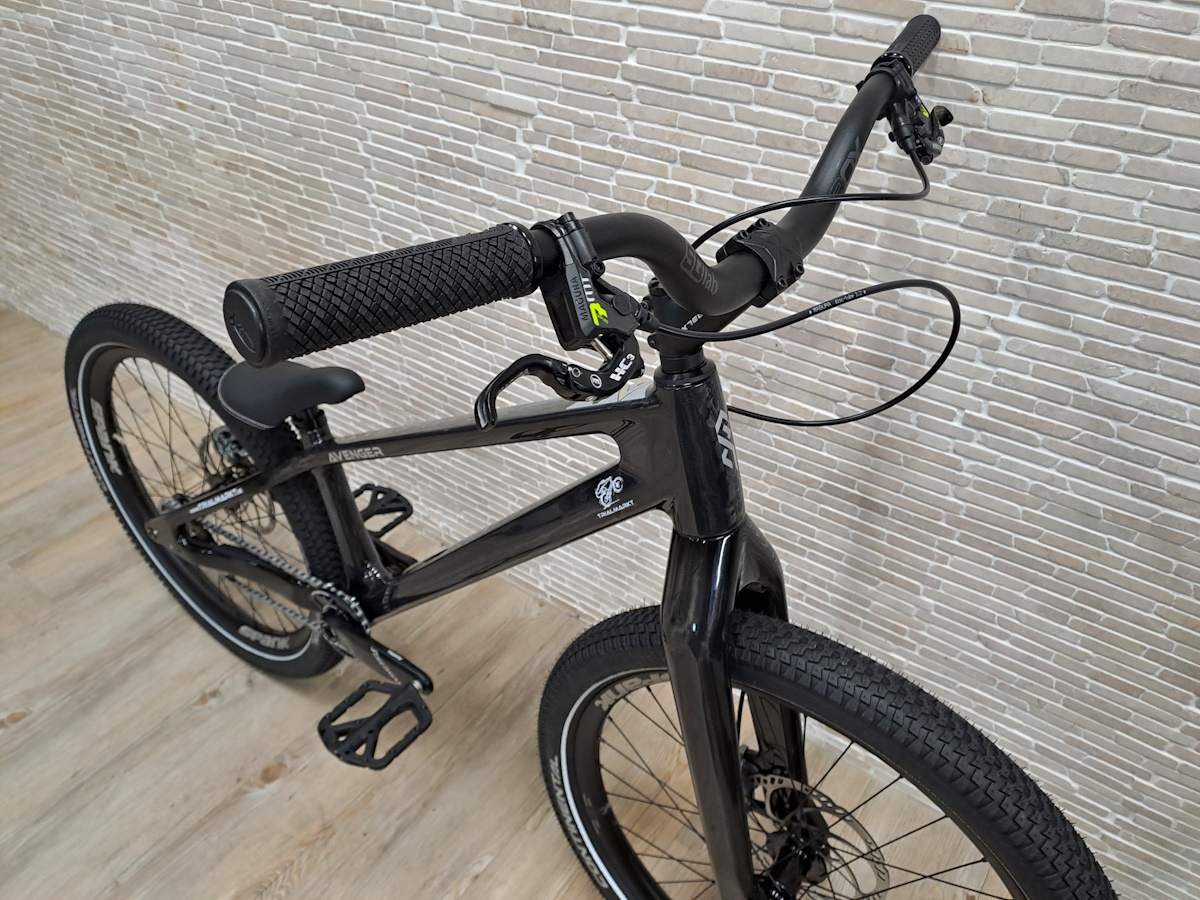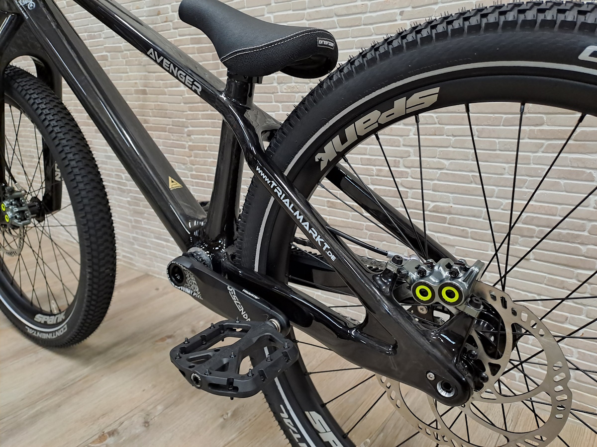Das superleichte Top Modell Avenger von Extention setzt auf verwindungssteifes Carbon und bewährte Komponenten von Hope, Magura, Truvativ und Spank. Sehr hochwertig verarbeiteter Carbon Rahmen und Gabel. Moderne Postmount Aufnahmen, innenverlegte Bremsleitungen und ein zuverlässiges Kettenspannersystem sind weitere Merkmale des Avengers. Zur weiteren Ausstattung gehören Lizard Skins Griffe und solide DUB Kurbeln mit 29mm Aluminiumachse. Zudem sind ein gepolsteter Sattel mit Aluminium Tripod Sattelstütze und hochwertige Plattformpedale montiert. Der 24" Rahmen ist sehr wendig und in jeder Situation gut zu kontrollieren, dank des kurzen Radstandes, des höheren Tretlagers und der kurzen Kettenstreben. 15mm Steckachse vorne, 12mm Steckachse hinten mit 142mm Einbaubreite, tapered Steuerrohr und innenverlegte Bremsleitung. Die hydraulischen Magura MT7 Scheibenbremsen mit HC3 Hebeln bieten Top Performance und präzise Einstellbarkeit. Hope Pro 5 Trial Freilaufnabe mit 108 Einrastpunkten und 22:16 Zähne Übersetzung. Solider Bashring mit Stecksystem und integriertem Aluminium Kettenblatt. Bewährte Continental Air King Bereifung.