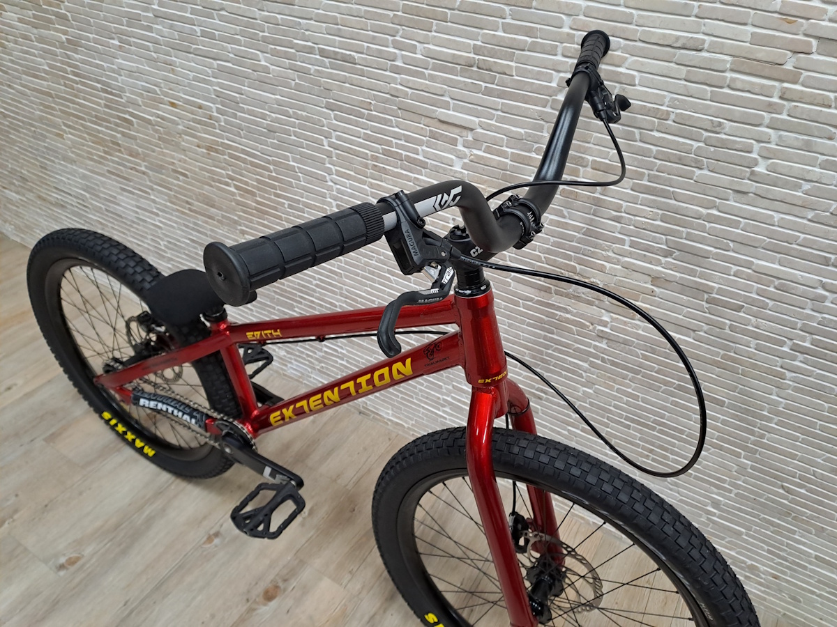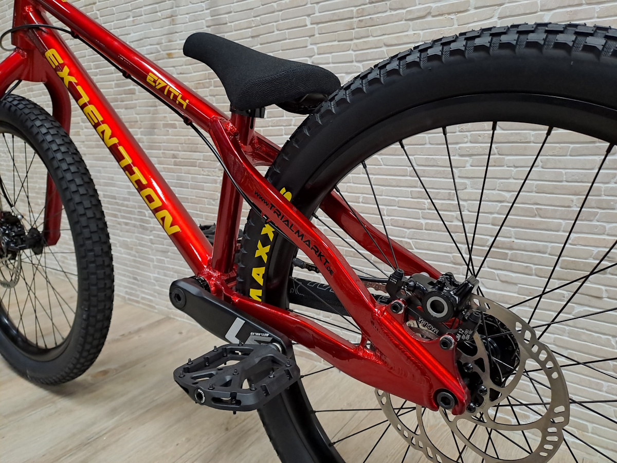 Das Extention Edith ist der Übergang zum nächsten Level und besitzt neben dem tapered Steuerrohr weiterhin vertikale Ausfallenden für einen festen Sitz des Hinterrades. Beides erhöht die Steifigkeit des Bikes und der Kettenspanner mit Umlenkrolle erleichtert das Einstellen der Kettenspannung. Der 24" Rahmen ist sehr wendig und in jeder Situation gut zu kontrollieren, dank des kurzen Radstandes, des höheren Tretlagers und der kurzen Kettenstreben. Top Ausstattung mit leichtem Aluminium High Riser Lenker, Gabel mit 15mm Steckachse, tapered Steuerrohr und innenverlegter Bremsleitung. Die hydraulischen Magura MT Trail Sport Scheibenbremsen bieten Top Performance mit 4-Kolben Bremszange vorne und ergonomischen HC Hebeln. Singlespeed mit vertikalen Ausfallenden und Freilaufritzel mit 108 Einrastpunkten hinten bei 22:16 Zähne Übersetzung. Extention Kurbeleinheit mit durchgehender 24mm Stahlachse mit Vielzahnaufnahme. Solider Bashring mit Stecksystem und integriertem Aluminium Kettenblatt. Griffige Nylon Plattform Pedale mit geschraubten Stahlpins. Bewährte Maxxis Bereifung.