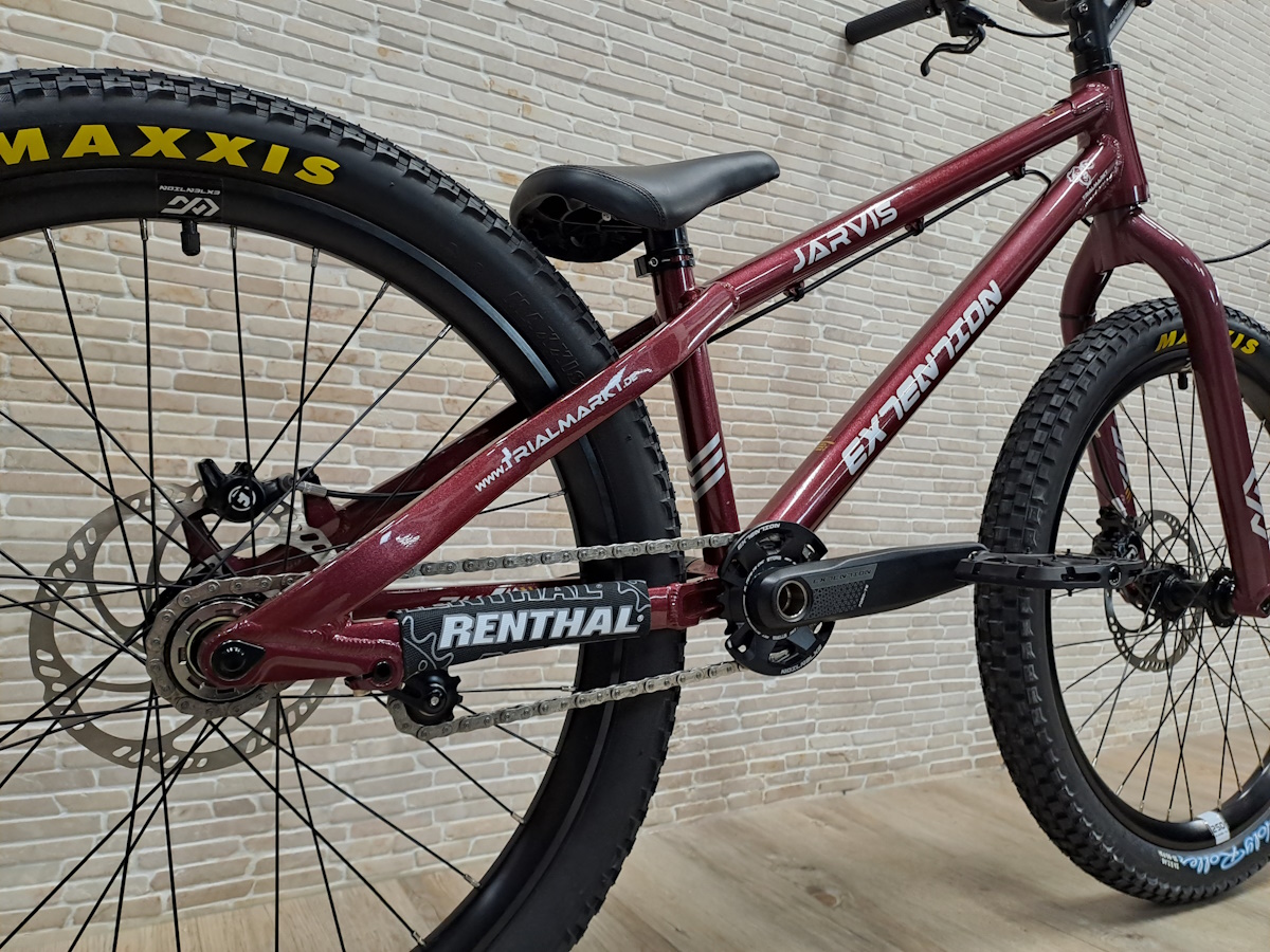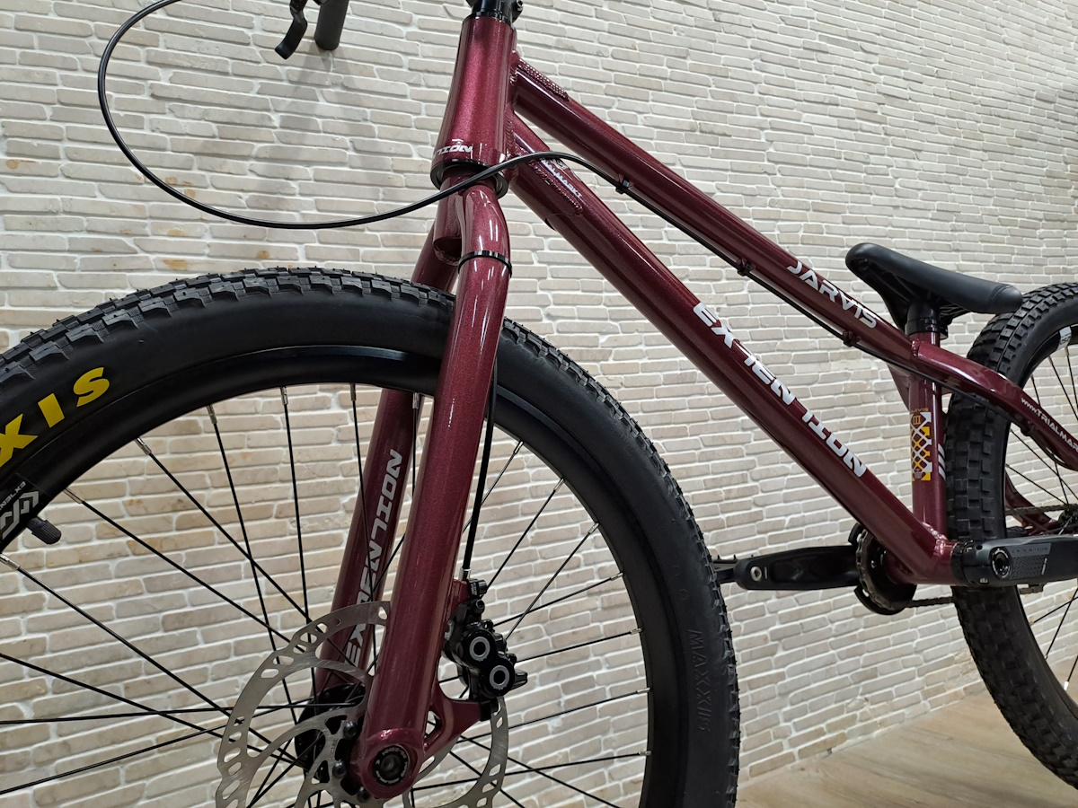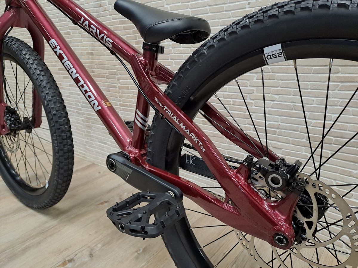Das Extention Jarvis besitzt im Vergleich zum Edith auch hinten eine Steckachse und hat moderne Postmount Aufnahmen für die Scheibenbremsen. Zu der hochwertigen Standardausstattung gehören bereits der Carbon Lenker, Lock-On Lenkergriffe und solide Kurbeln mit 24mm Stahlachse. Zudem sind hochwertige und leichte Nylon Plattformpedale montiert. Der 24" Rahmen ist sehr wendig und in jeder Situation gut zu kontrollieren, dank des sehr kurzen Radstandes, des höheren Tretlagers und der kurzen Kettenstreben. Top Ausstattung mit 15mm Steckachse vorne, 12mm Steckachse hinten mit 142mm Einbaubreite, tapered Steuerrohr und innenverlegter Bremsleitung. Die hydraulischen Magura MT Trail Sport Scheibenbremsen bieten Top Performance mit 4-Kolben Bremszange vorne und ergonomischen HC Hebeln. Freilaufritzel mit 108 Einrastpunkten hinten bei 22:16 Zähne Übersetzung. Solider Bashring mit Stecksystem und integriertem Aluminium Kettenblatt. Bewährte Maxxis Bereifung.