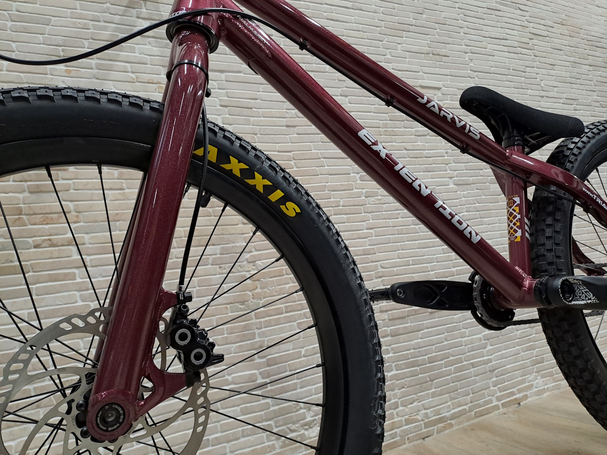 Das Extention Jarvis besitzt im Vergleich zum Edith auch hinten eine Steckachse und hat moderne Postmount Aufnahmen für die Scheibenbremsen. Zu der hochwertigen Standardausstattung gehören bereits Lock-On Lenkergriffe und solide Truvativ DUB Kurbeln mit 29mm Aluminiumachse. Zudem sind hochwertige und leichte Nylon Plattformpedale montiert. Der 24" Rahmen ist sehr wendig und in jeder Situation gut zu kontrollieren, dank des sehr kurzen Radstandes, des höheren Tretlagers und der kurzen Kettenstreben. Top Ausstattung mit 15mm Steckachse vorne, 12mm Steckachse hinten mit 142mm Einbaubreite, tapered Steuerrohr und innenverlegter Bremsleitung. Die hydraulischen Magura MT Trail Sport Scheibenbremsen bieten Top Performance mit 4-Kolben Bremszange vorne und ergonomischen HC Hebeln. Die select+ Variante beinhaltet eine Raid Freilaufnabe mit 126 Einrastpunkten mit einem Steckritzel bei einer 22:16 Zähne Übersetzung. Solider Bashring mit Stecksystem und integriertem Aluminium Kettenblatt. Bewährte Maxxis Bereifung.