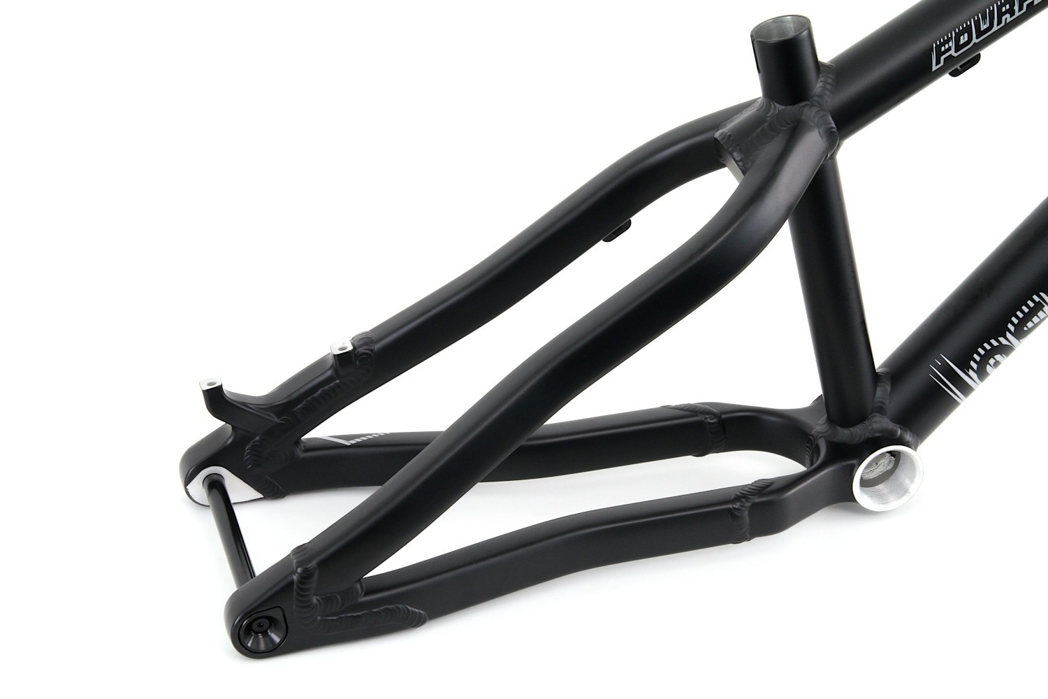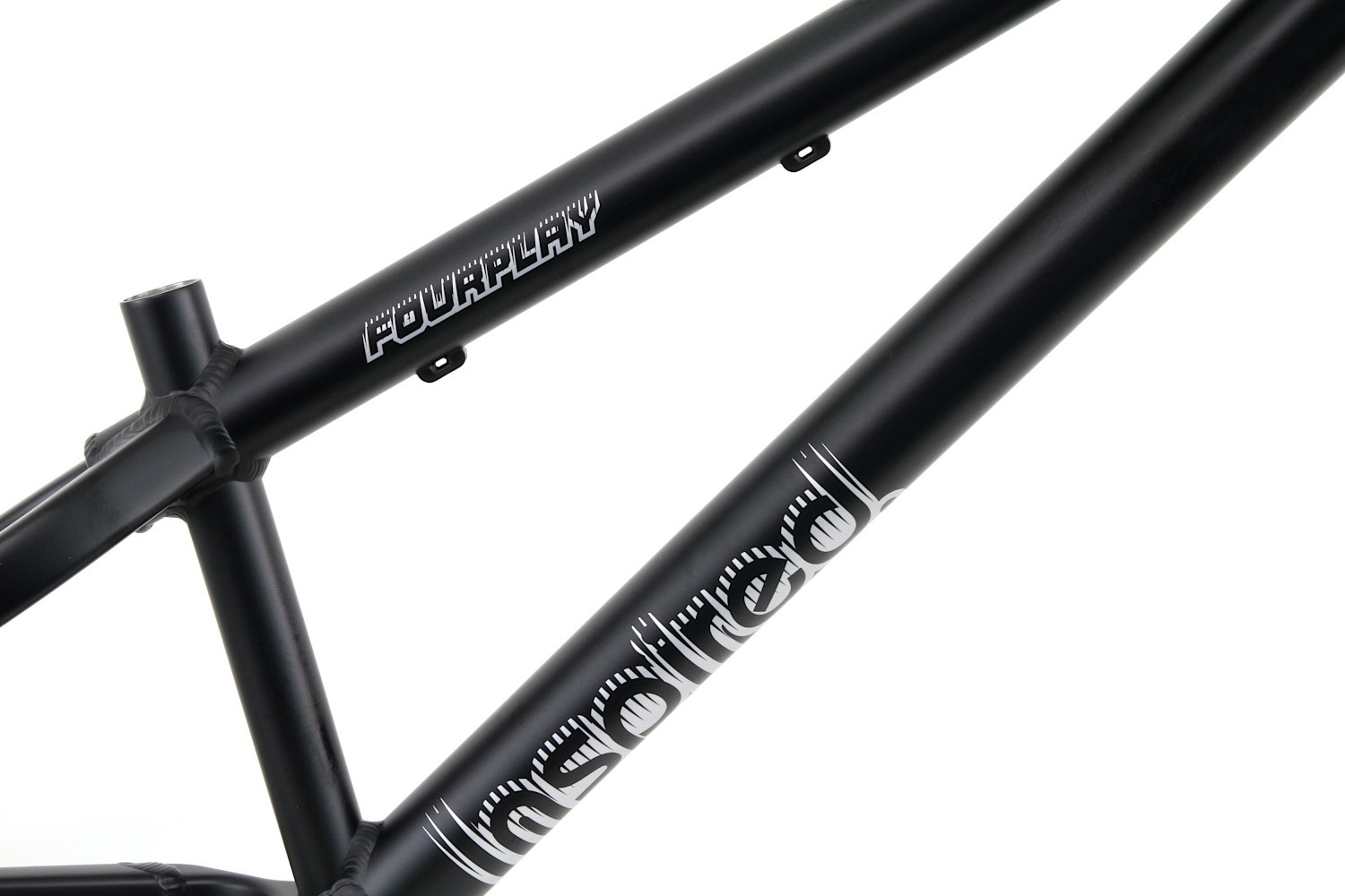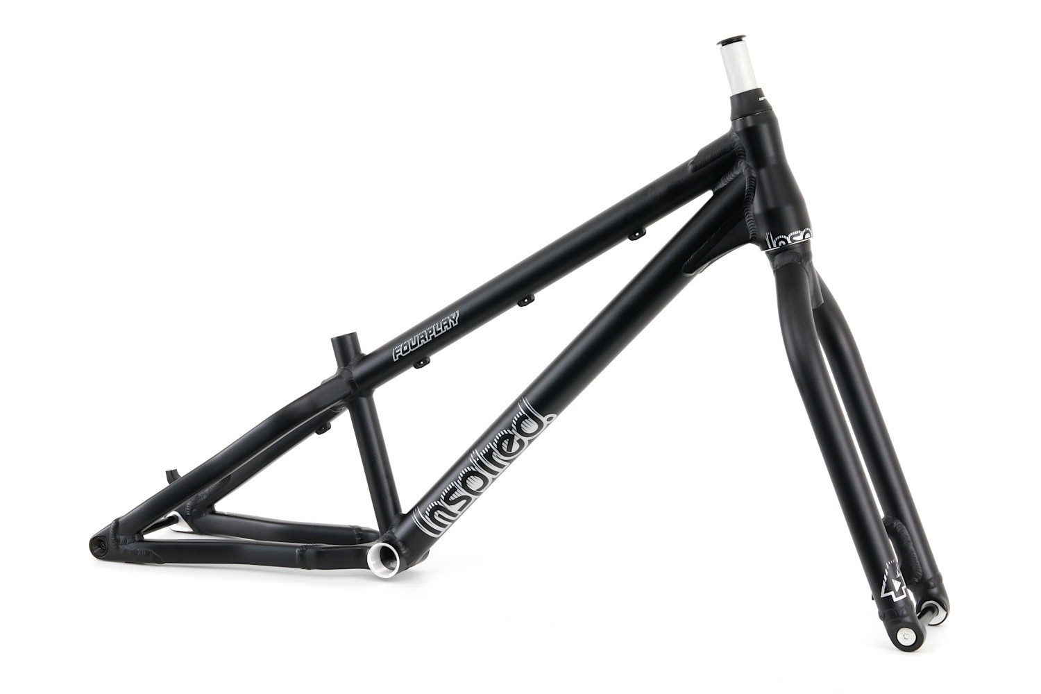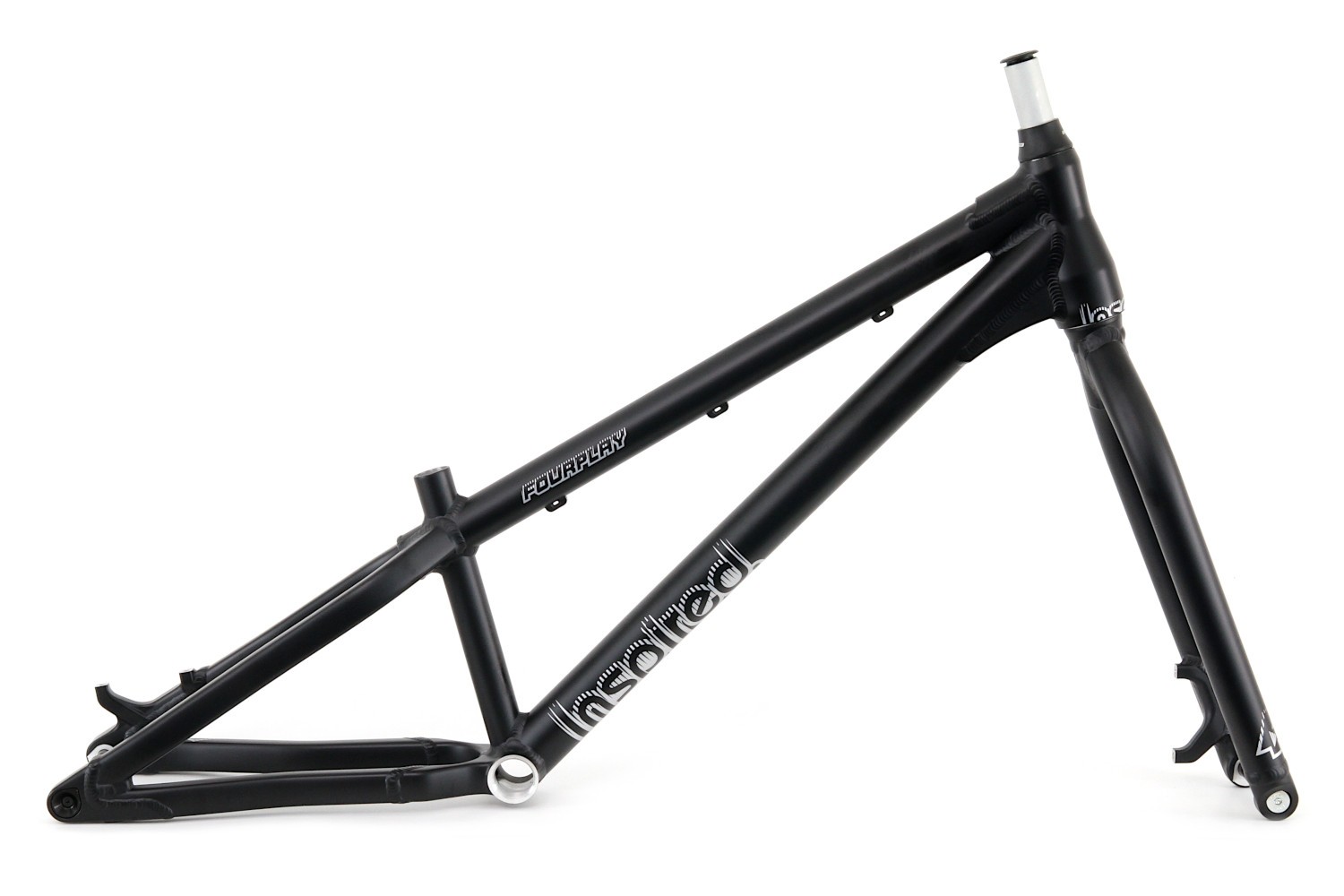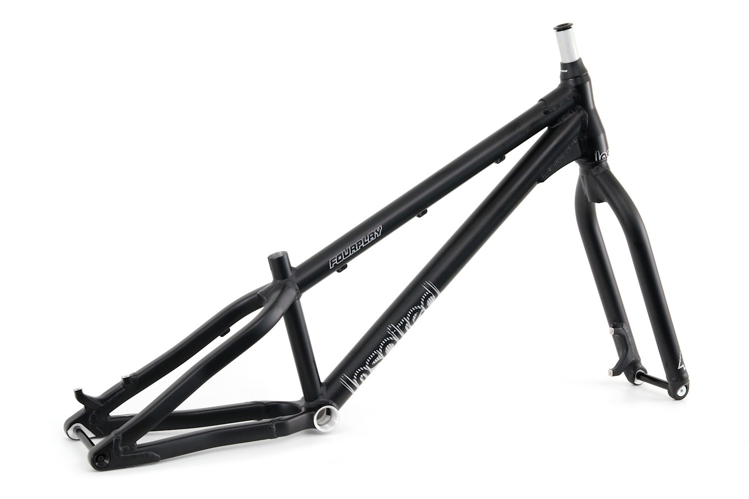 Das aktuelle Fourplay mit leicht geänderter Geometrie und integriertem Steuersatz als Rahmen-Kit mit Gabel, Steuersatz, Steckachsen und Kettenspanner. Das Fourplay bietet eine perfekte Allround/Street Geometrie und besitzt ein tapered Steuerrohr und eine Gabel mit 15mm Steckachse. Der Rahmen ist mit einer 12mm Steckachse ausgerüstet für 135mm Einbaubreite der Nabe. Die robuste Bauweise des Aluminium Rahmens mit 4-Kant Hinterbau und Verstärkungen an den belasteten Stellen verspricht eine lange Haltbarkeit. Kurzer Radstand mit höherem Tretlager ergeben eine hohe Wendigkeit bei guter Laufruhe. Tretlagergehäuse 73mm, ausgelegt auf 51mm Kettenlinie. Postmount Aufnahme für Scheibenbremse mit 180mm Scheiben.